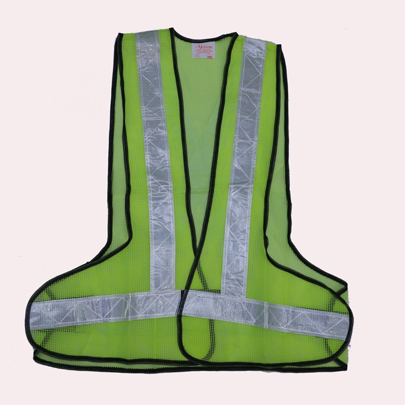 Reflective safety jacket is made of net type fabric with thickness of 150GSM with